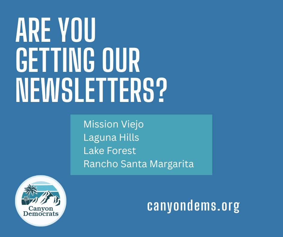 Canyon Democrats come from the communities of Trabuco, Santiago, Silverado, Modjeska and Dove Canyons, Foothill Ranch, Rancho Santa Margarita, Coto de Caza, Ladera Ranch, Laguna Hills, Lake Forest, Mission Viejo and others.